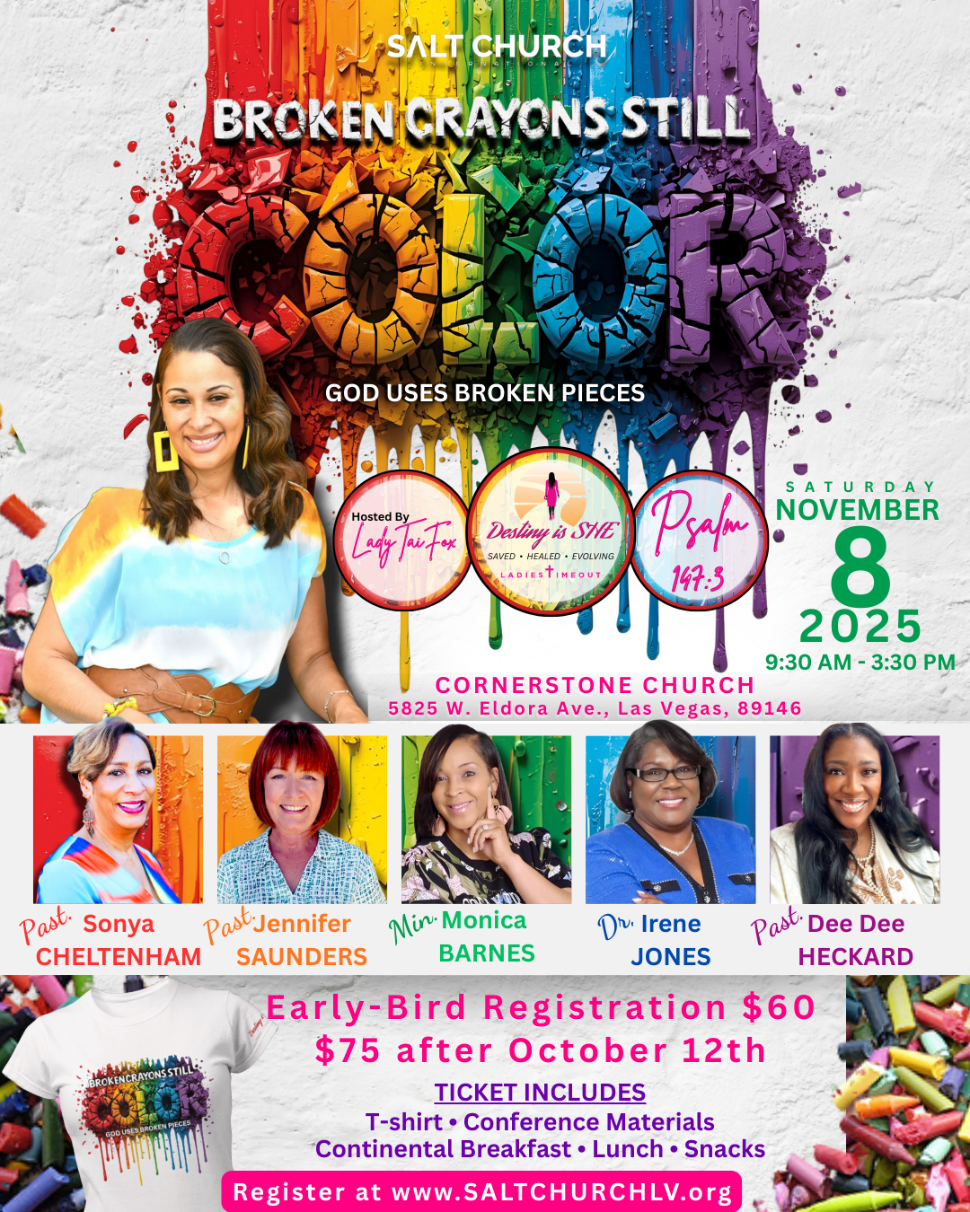 Early-Bird registration is NOW OPEN for the 2025 Ladies Timeout "Broken Crayons Still Color: God uses broken pieces". Spaces are filling up fast! Register today, get your conference tee, and save! Pending remaining space, general registration will begin on Oct 13. Don't miss this powerful day of power and healing. Click here to register!